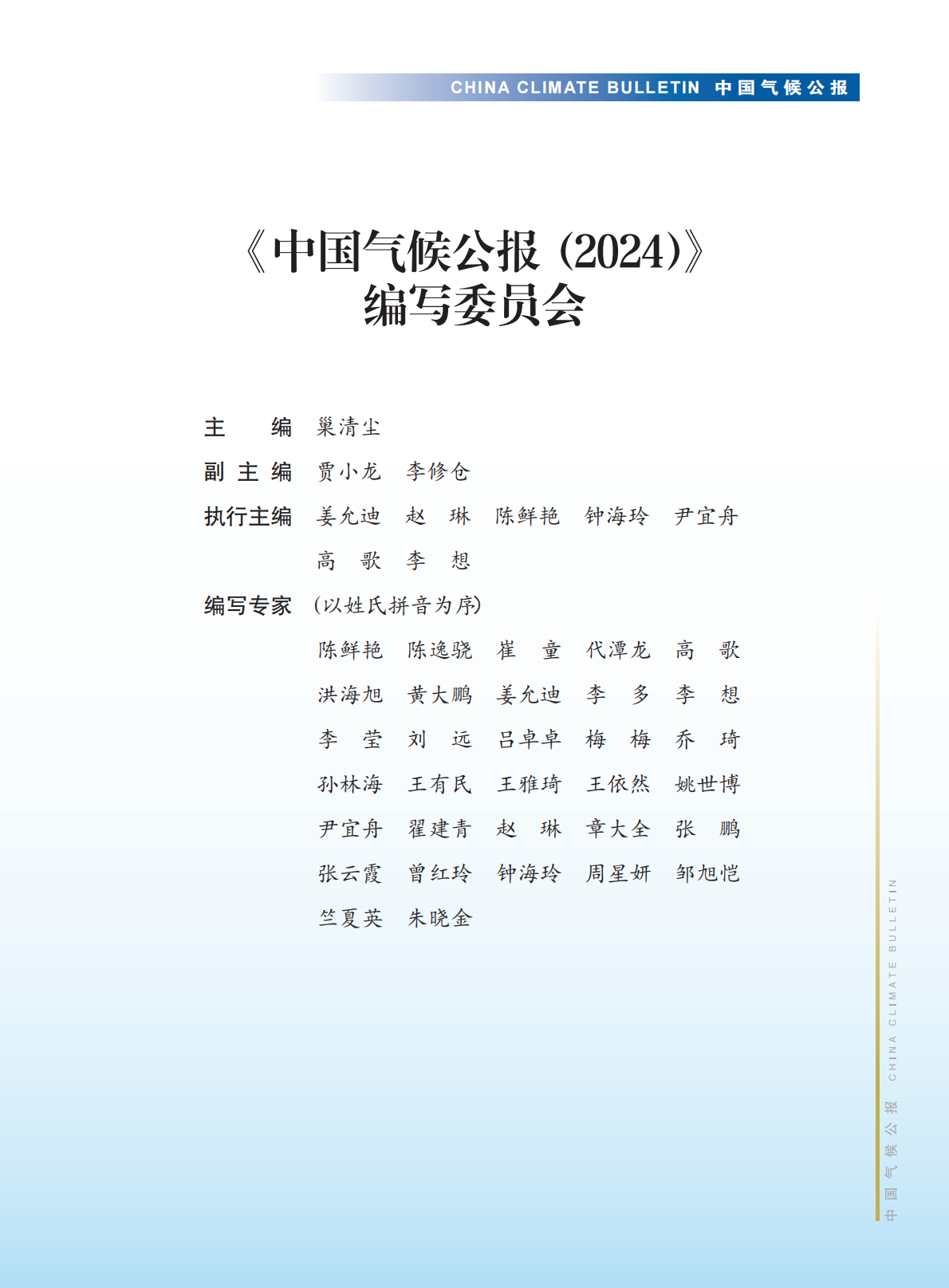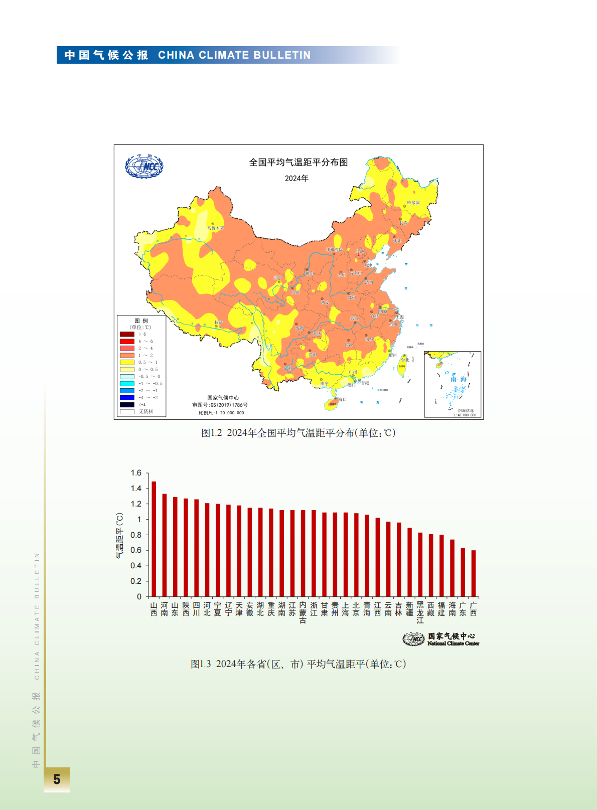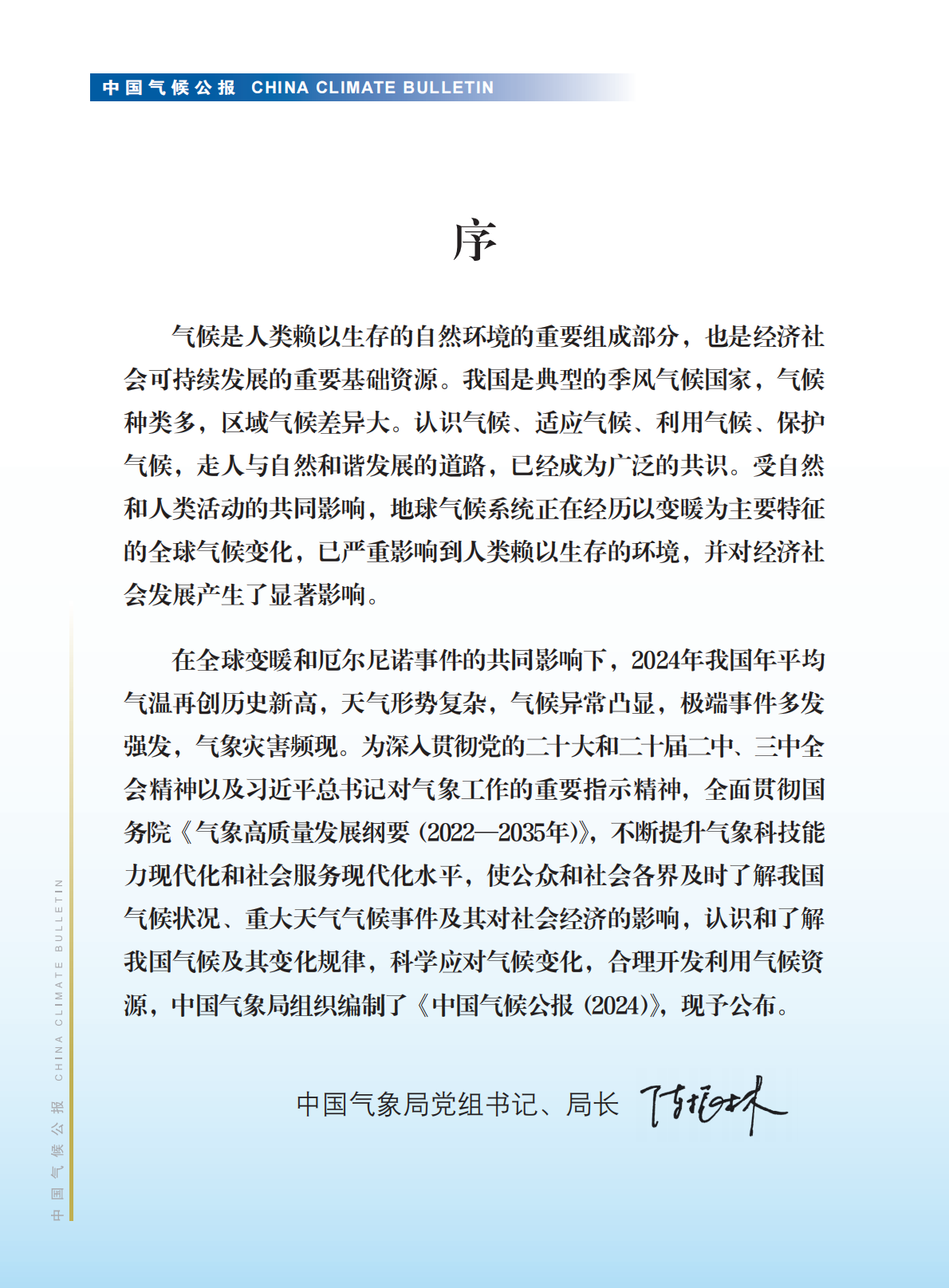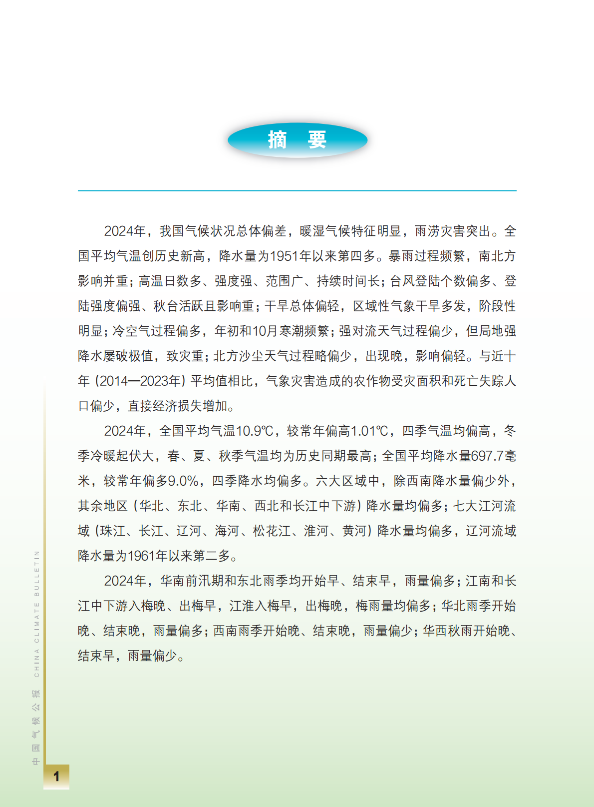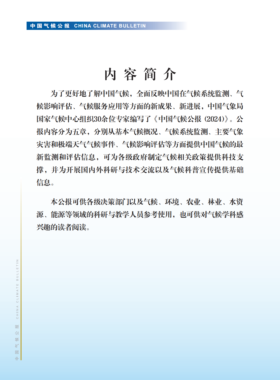 为了更好地了解中国气候,全面反映中国在气候系统监测、气候影响评估、气候服务应用等方面的新成果、新进展,中国气象局国家气候中心组织30余位专家编写了《中国气候公报(2024)》。公报内容分为五章,分别从基本气候概况、气候系统监测、主要气象灾害和极端天气气候事件、气候影响评估等方面提供中国气候的最新监测和评估信息,可为各级政府制定气候相关政策提供科技支撑,并为开展国内外科研与技术交流以及气候科普宣传提供基础信息。