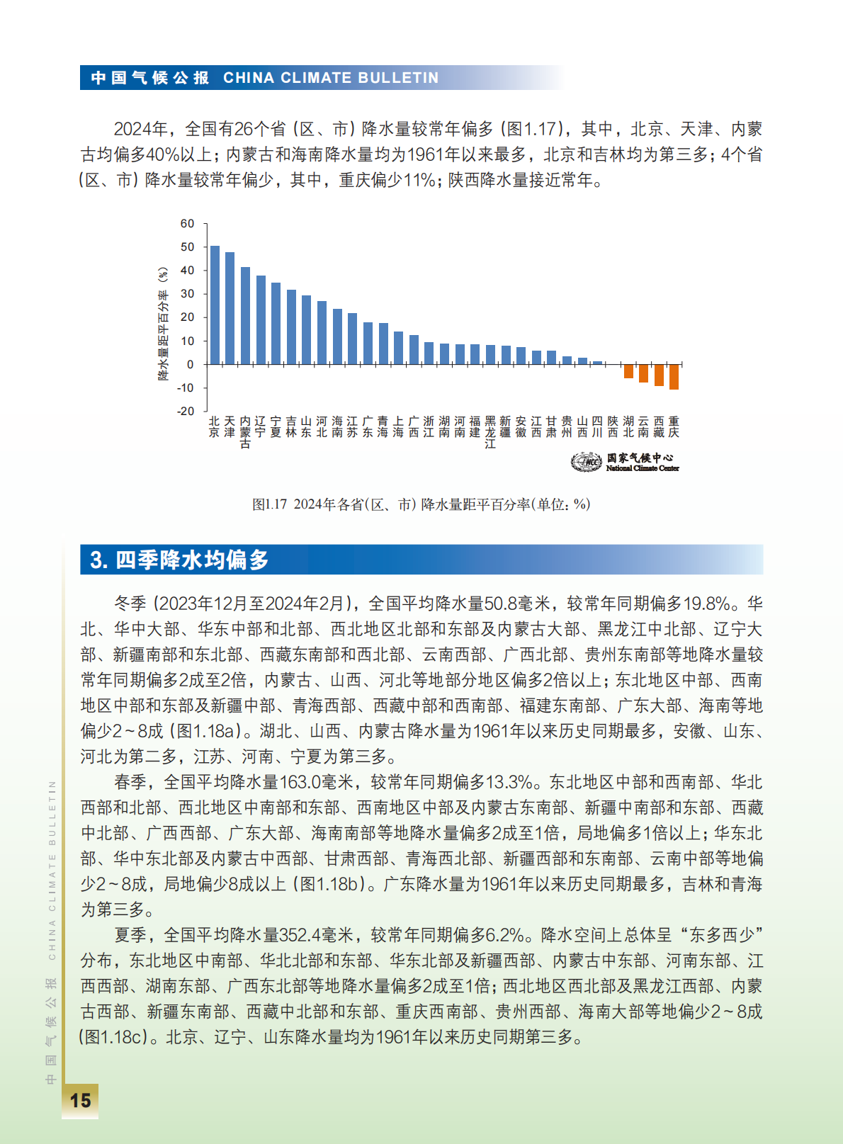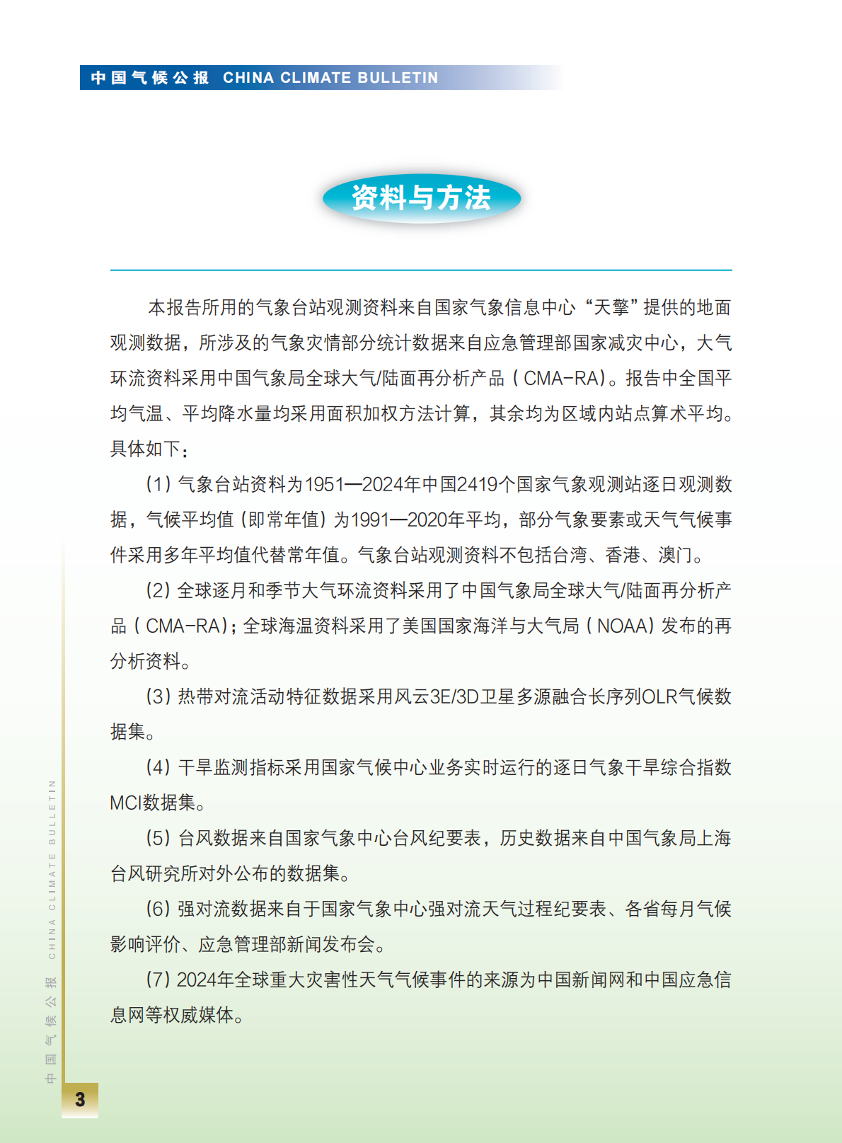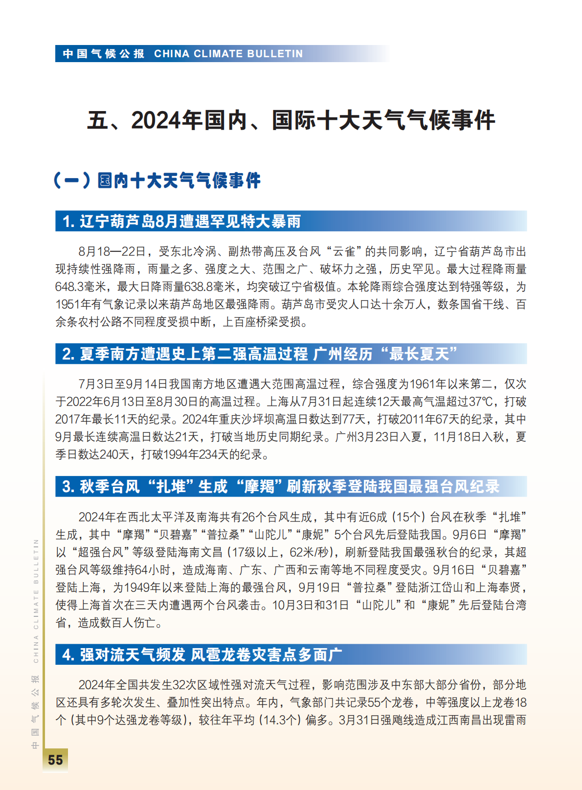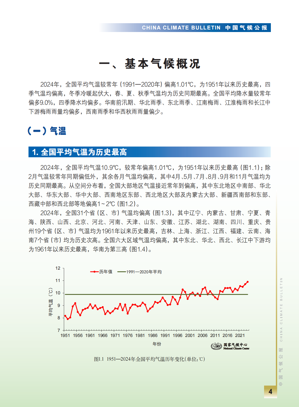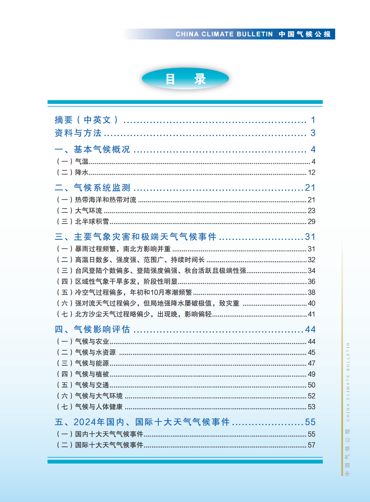 为了更好地了解中国气候,全面反映中国在气候系统监测、气候影响评估、气候服务应用等方面的新成果、新进展,中国气象局国家气候中心组织30余位专家编写了《中国气候公报(2024)》。公报内容分为五章,分别从基本气候概况、气候系统监测、主要气象灾害和极端天气气候事件、气候影响评估等方面提供中国气候的最新监测和评估信息,可为各级政府制定气候相关政策提供科技支撑,并为开展国内外科研与技术交流以及气候科普宣传提供基础信息。