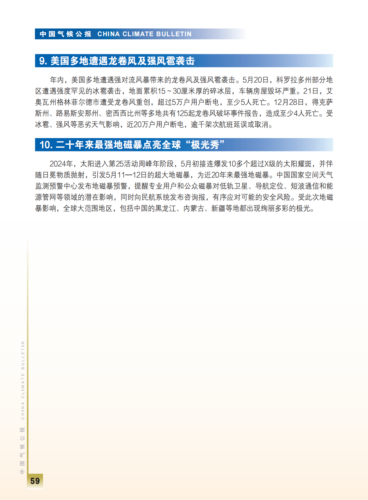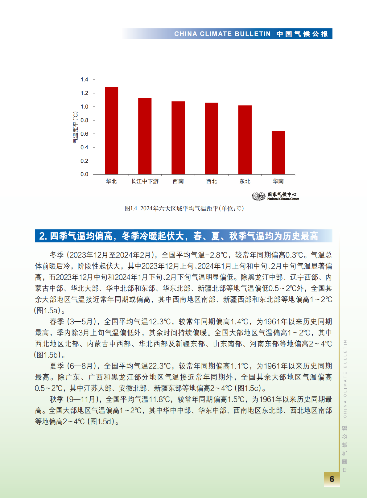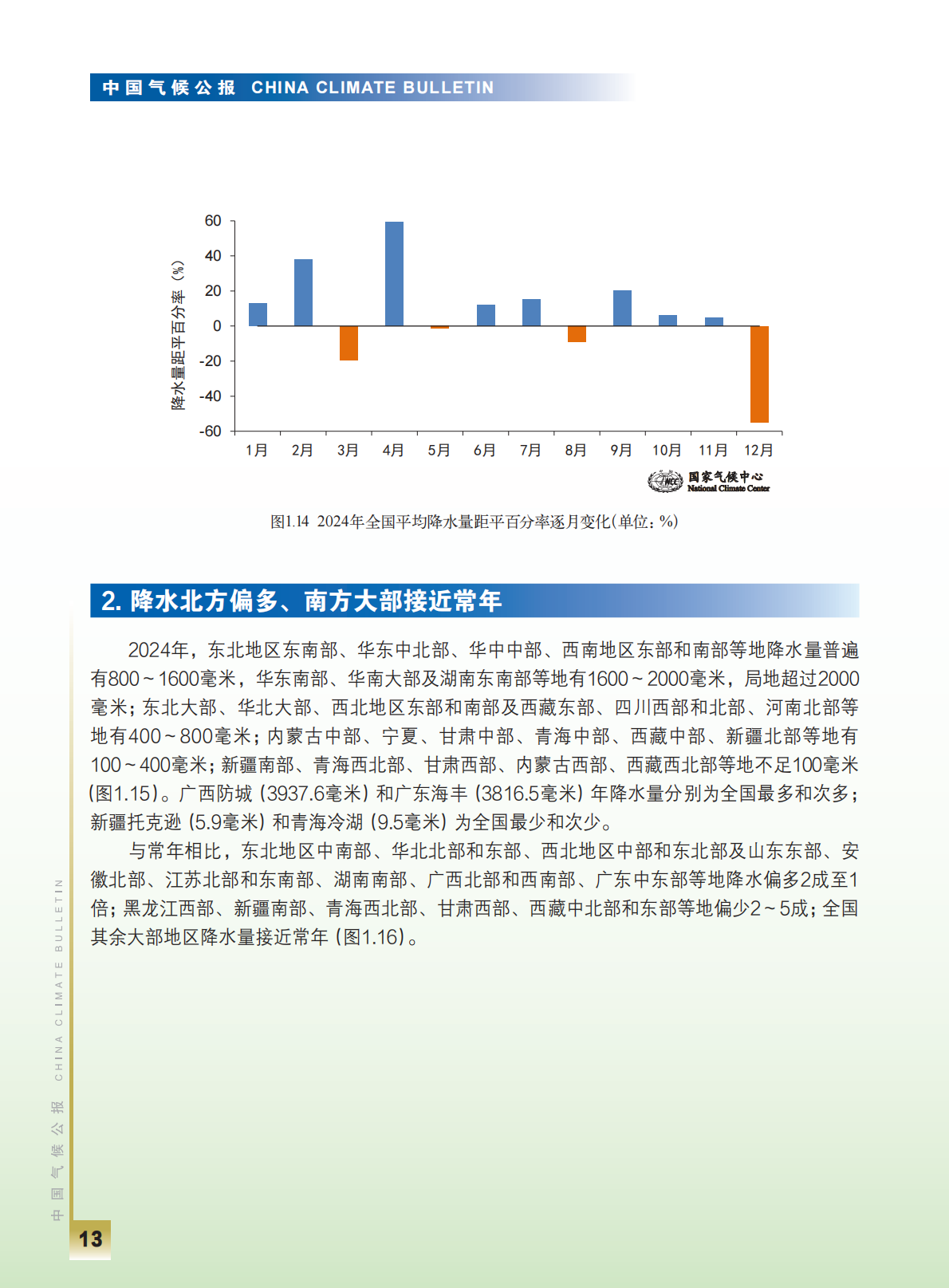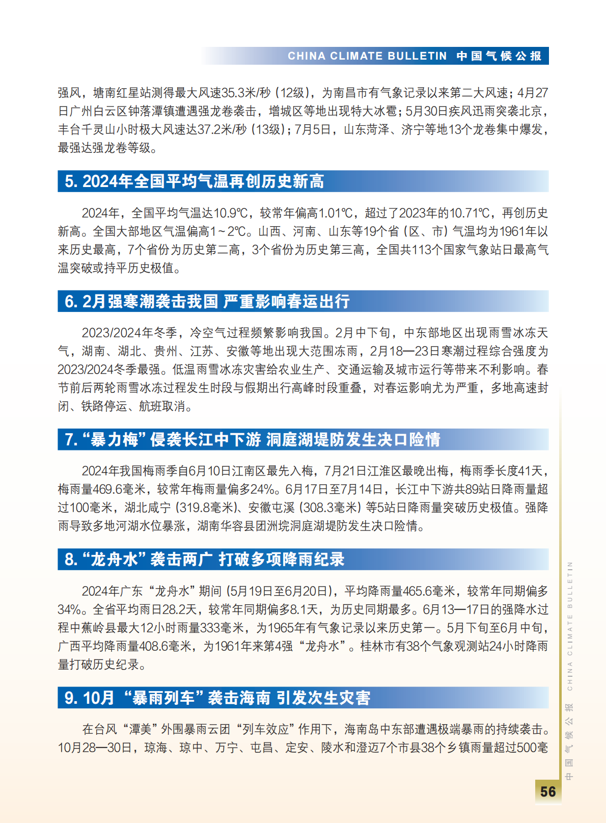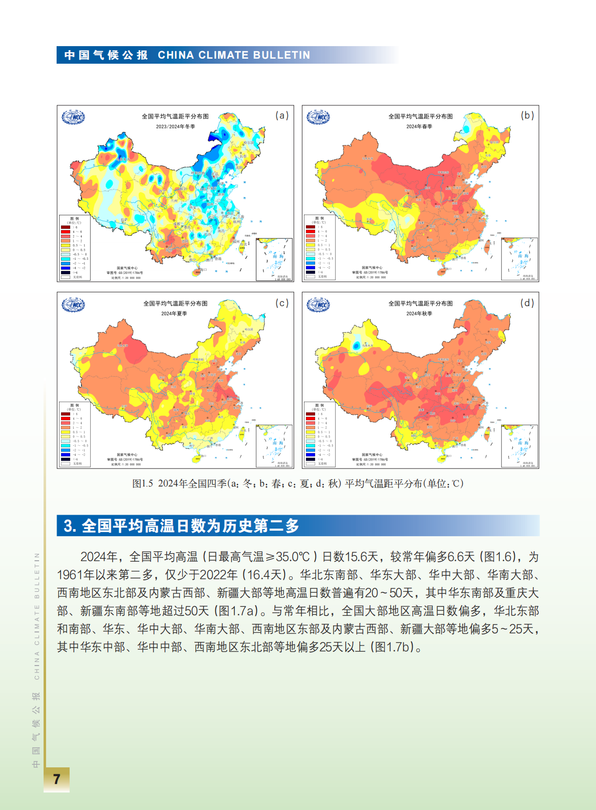 为了更好地了解中国气候,全面反映中国在气候系统监测、气候影响评估、气候服务应用等方面的新成果、新进展,中国气象局国家气候中心组织30余位专家编写了《中国气候公报(2024)》。公报内容分为五章,分别从基本气候概况、气候系统监测、主要气象灾害和极端天气气候事件、气候影响评估等方面提供中国气候的最新监测和评估信息,可为各级政府制定气候相关政策提供科技支撑,并为开展国内外科研与技术交流以及气候科普宣传提供基础信息。