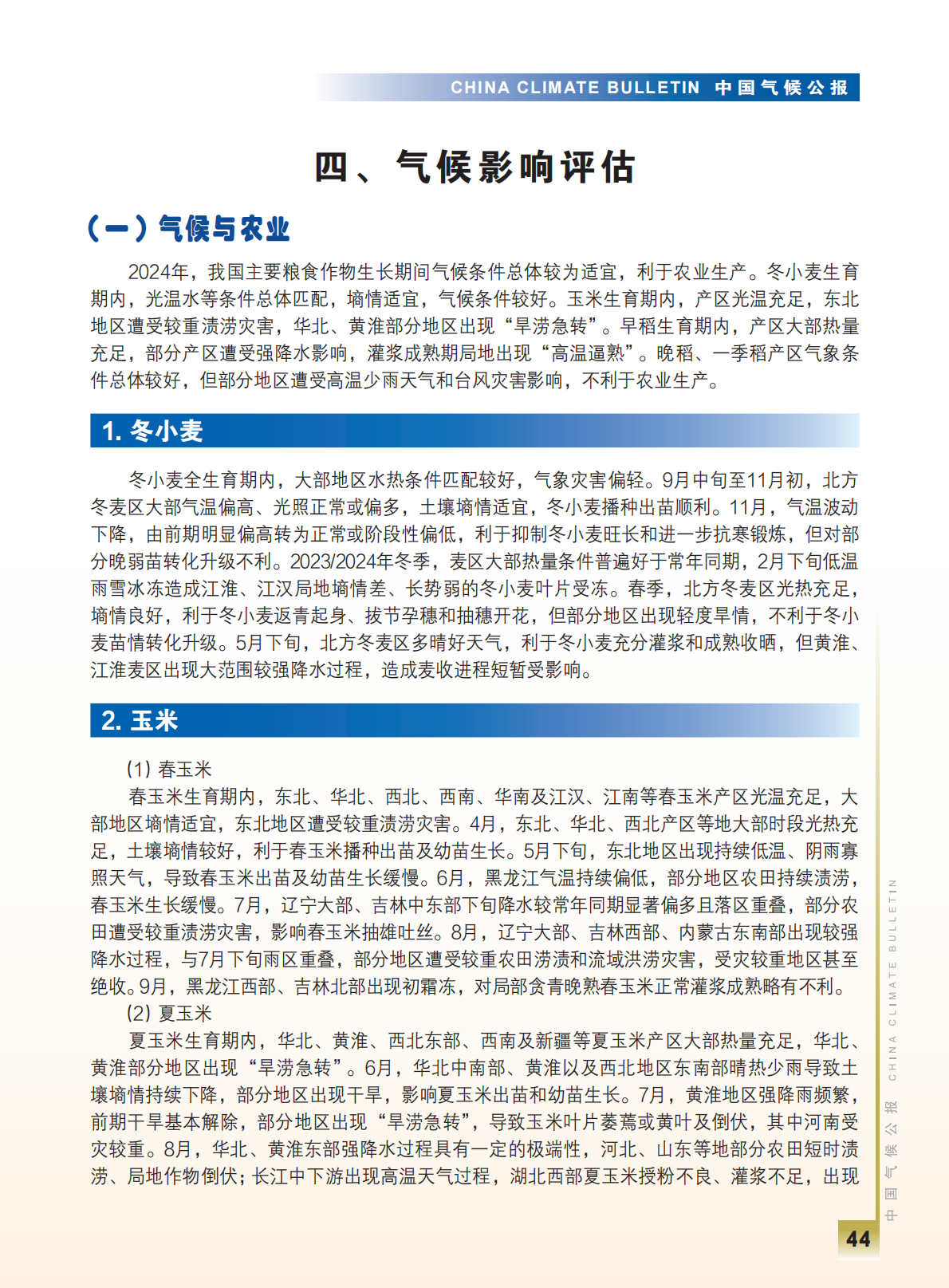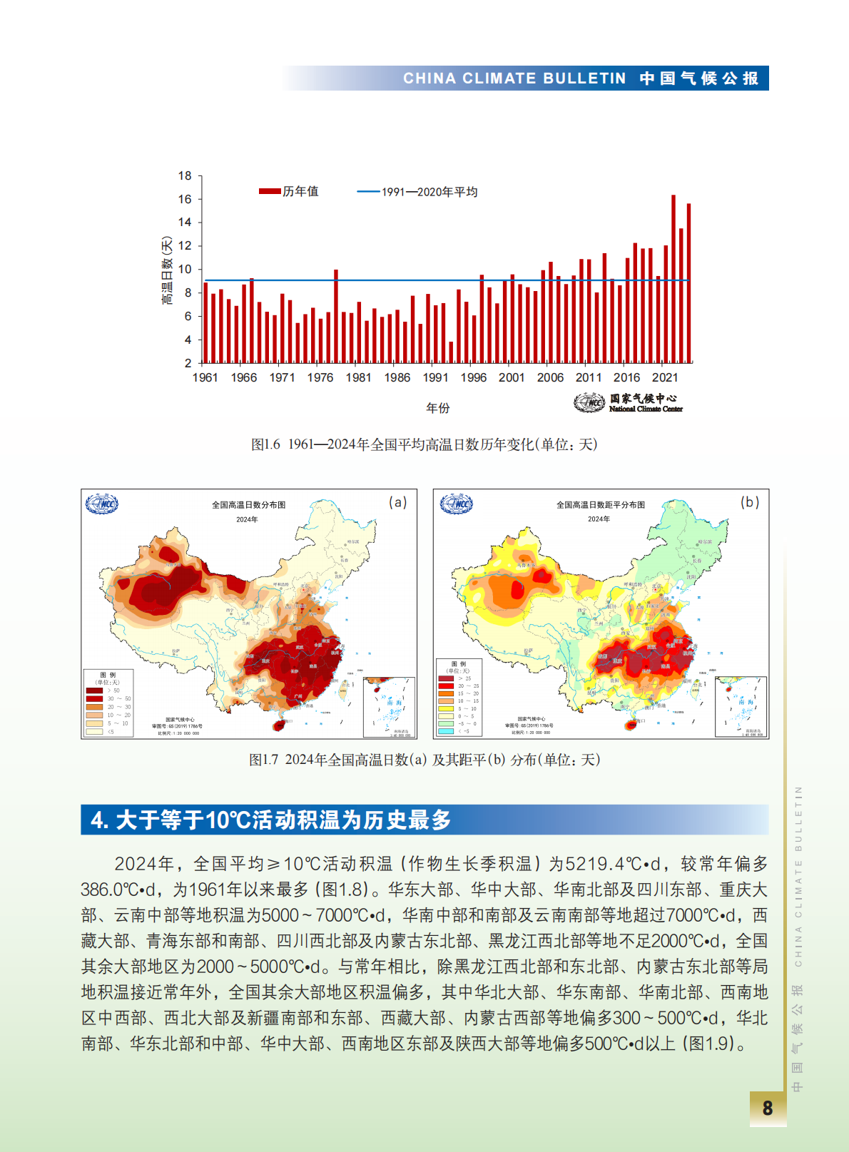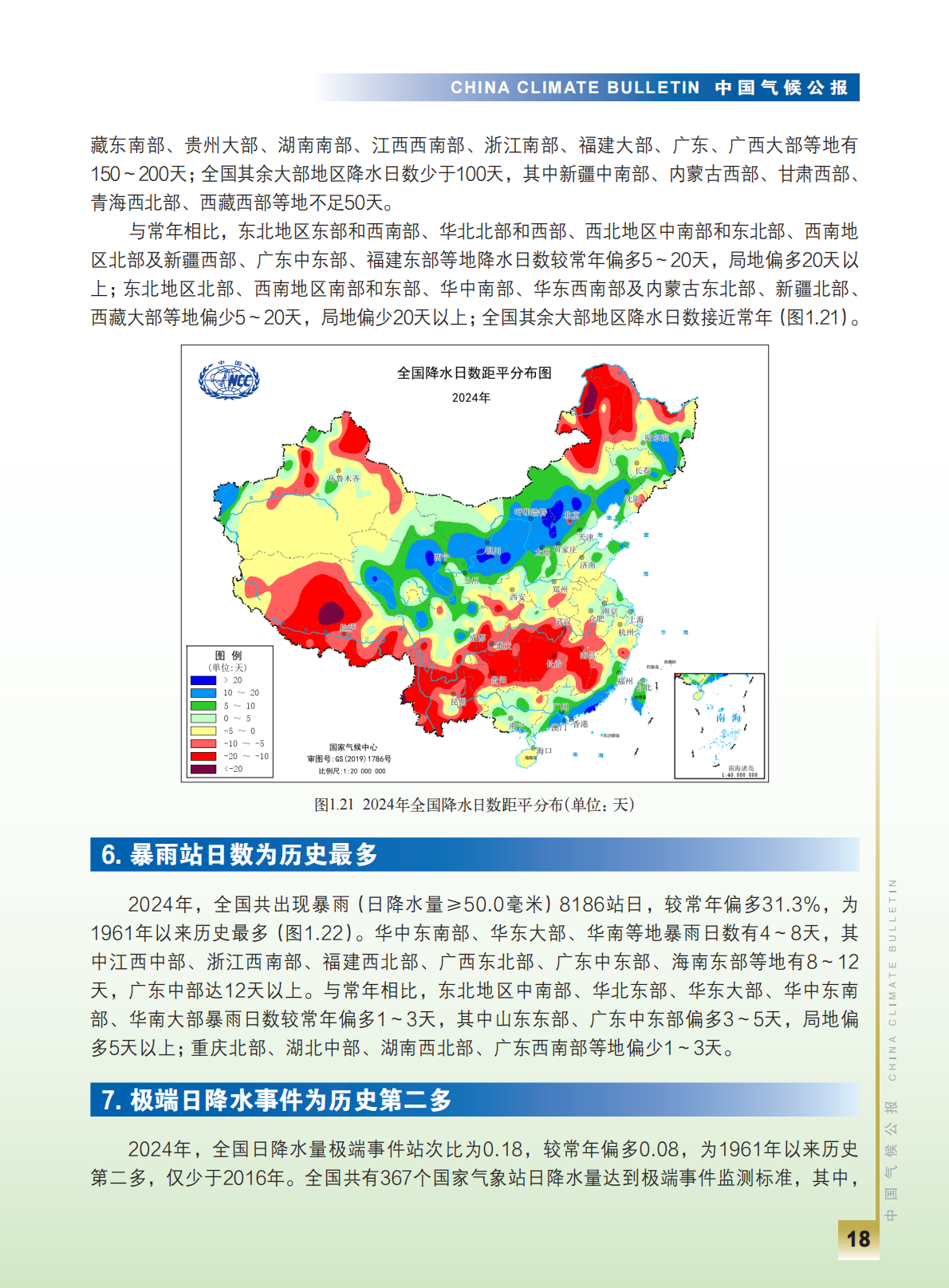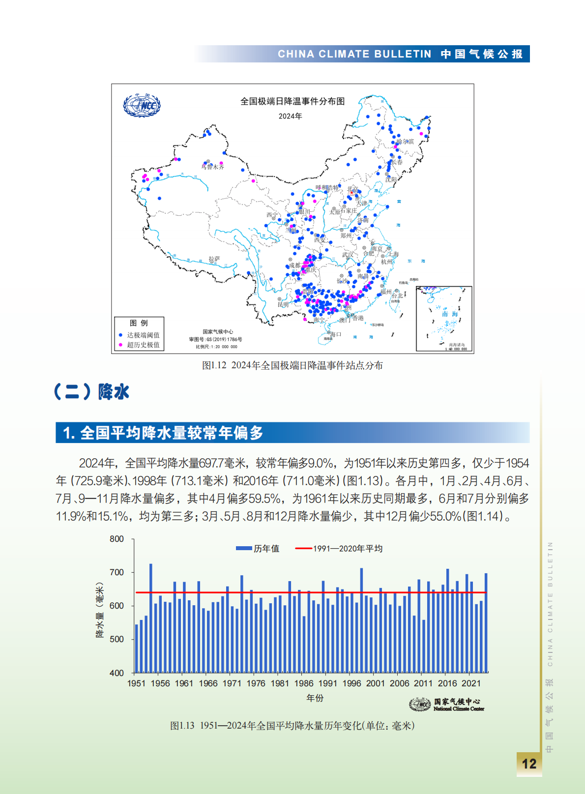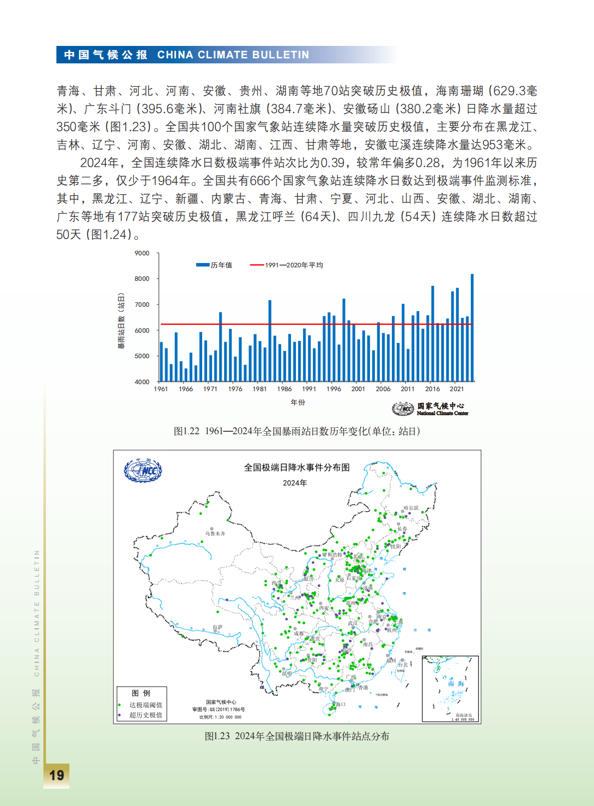 为了更好地了解中国气候,全面反映中国在气候系统监测、气候影响评估、气候服务应用等方面的新成果、新进展,中国气象局国家气候中心组织30余位专家编写了《中国气候公报(2024)》。公报内容分为五章,分别从基本气候概况、气候系统监测、主要气象灾害和极端天气气候事件、气候影响评估等方面提供中国气候的最新监测和评估信息,可为各级政府制定气候相关政策提供科技支撑,并为开展国内外科研与技术交流以及气候科普宣传提供基础信息。