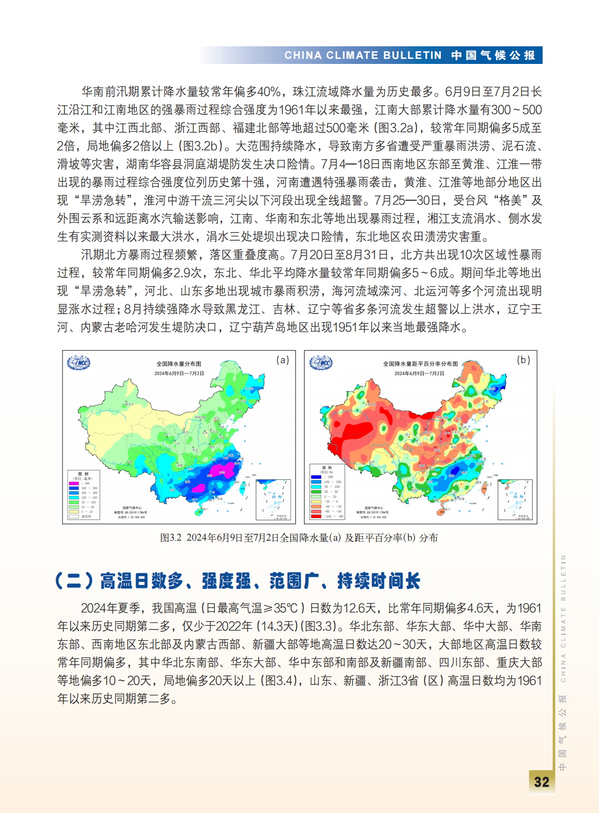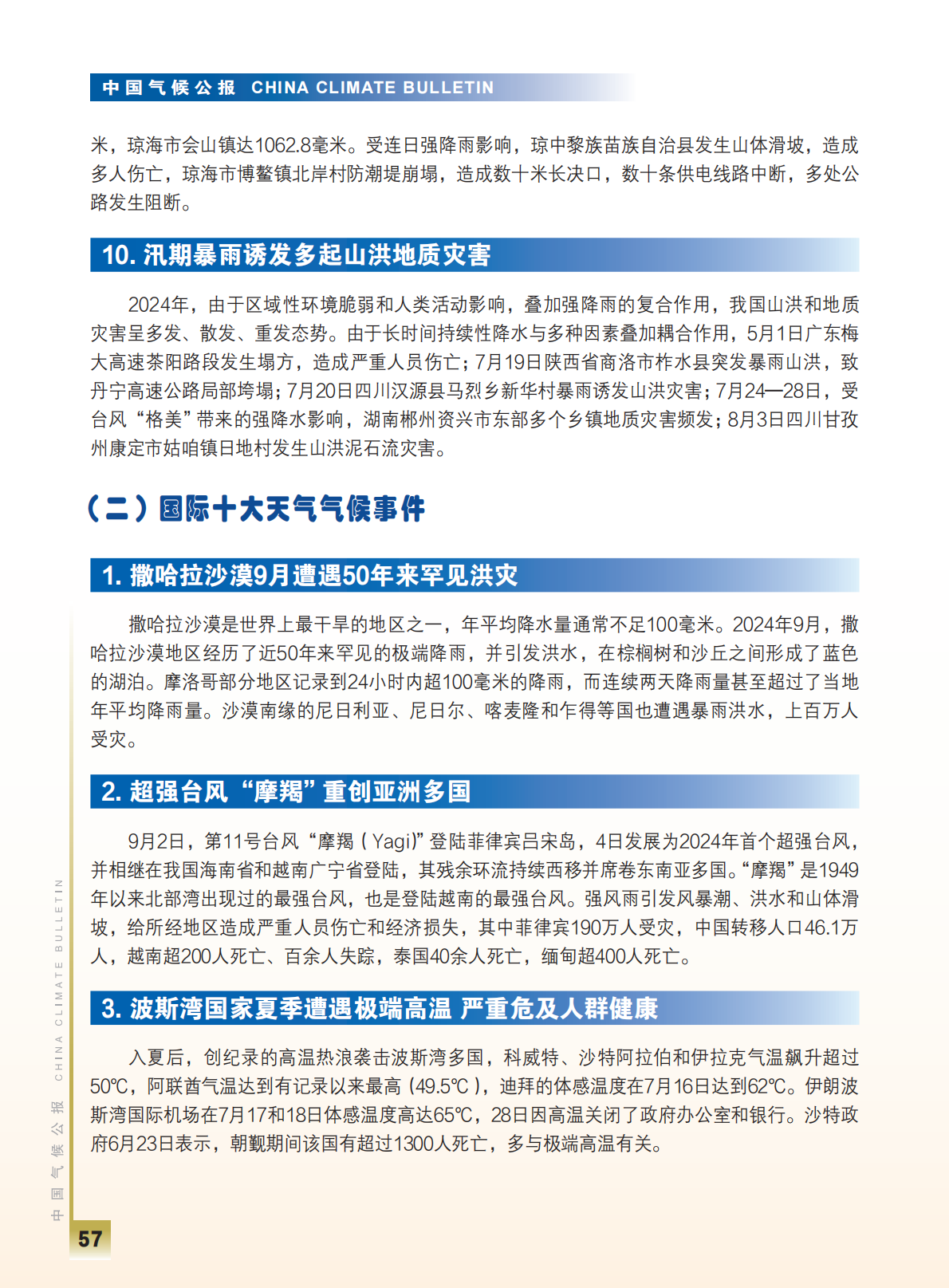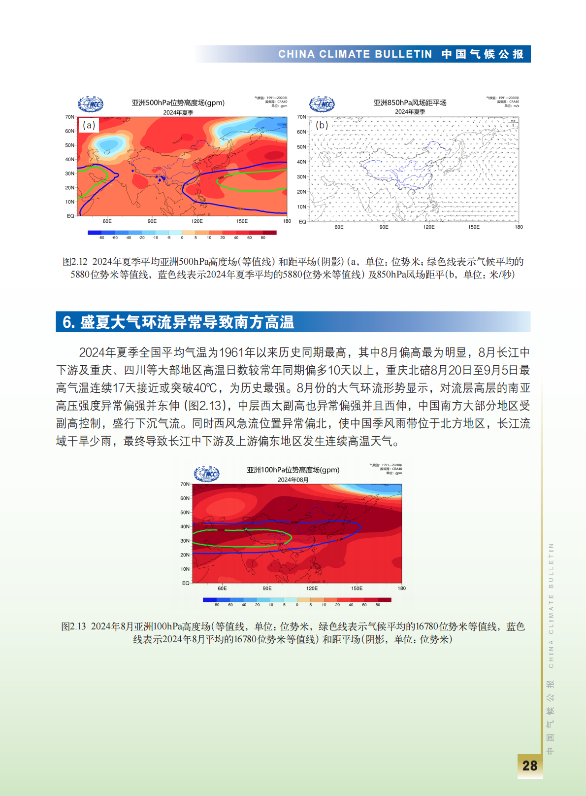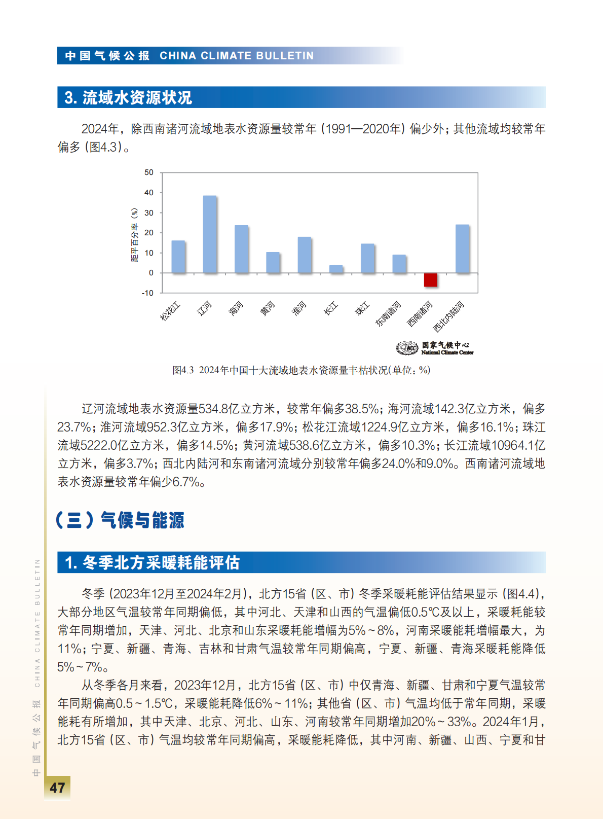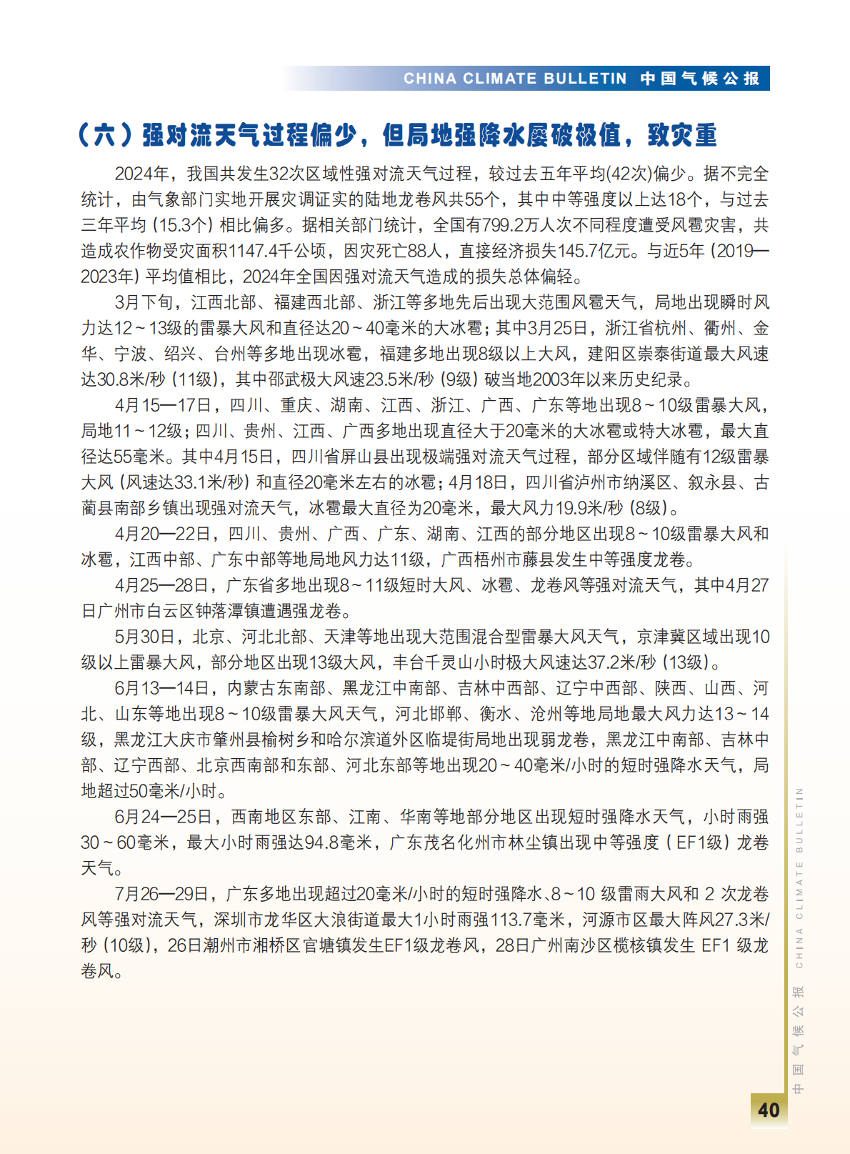 为了更好地了解中国气候,全面反映中国在气候系统监测、气候影响评估、气候服务应用等方面的新成果、新进展,中国气象局国家气候中心组织30余位专家编写了《中国气候公报(2024)》。公报内容分为五章,分别从基本气候概况、气候系统监测、主要气象灾害和极端天气气候事件、气候影响评估等方面提供中国气候的最新监测和评估信息,可为各级政府制定气候相关政策提供科技支撑,并为开展国内外科研与技术交流以及气候科普宣传提供基础信息。