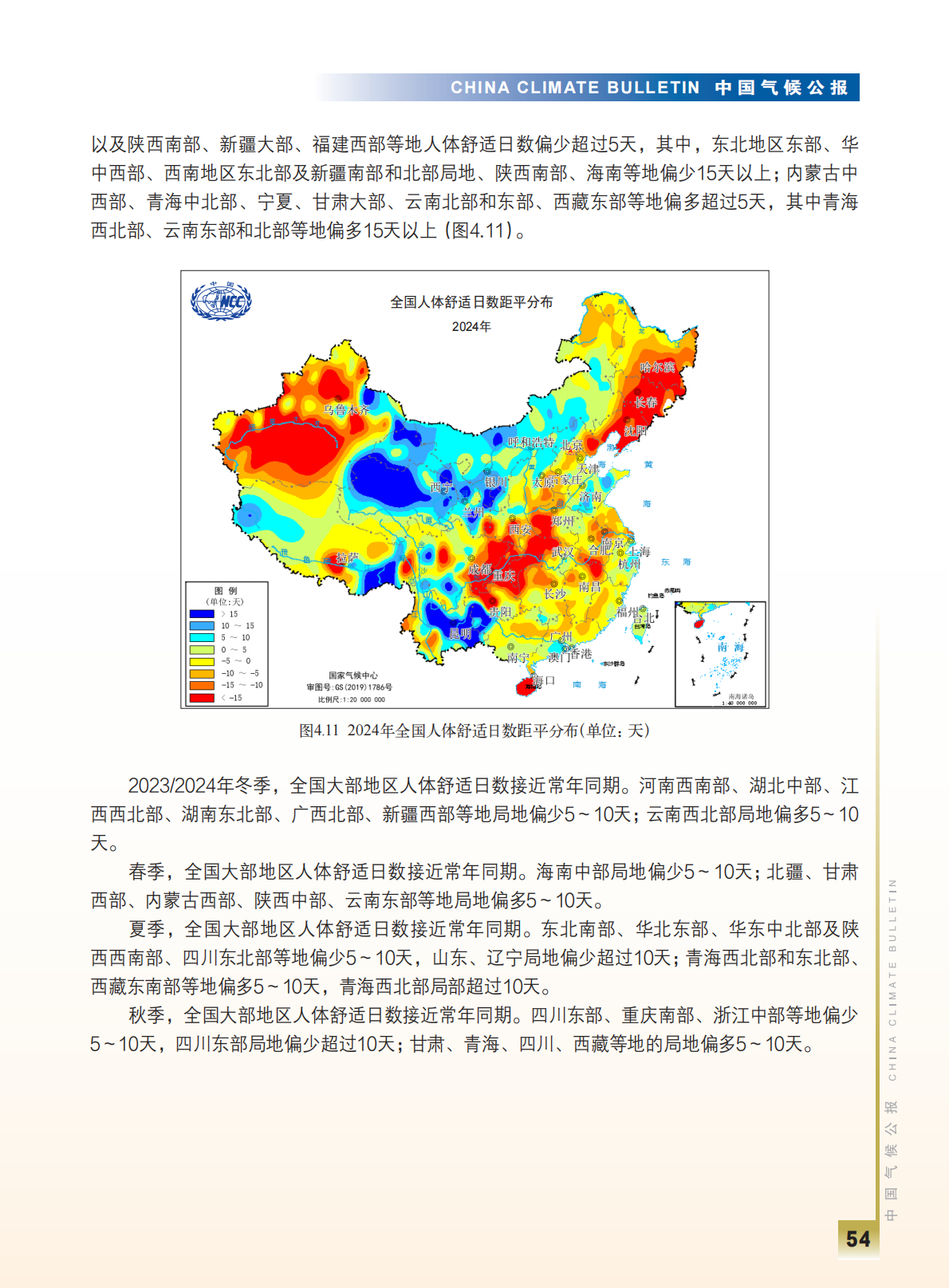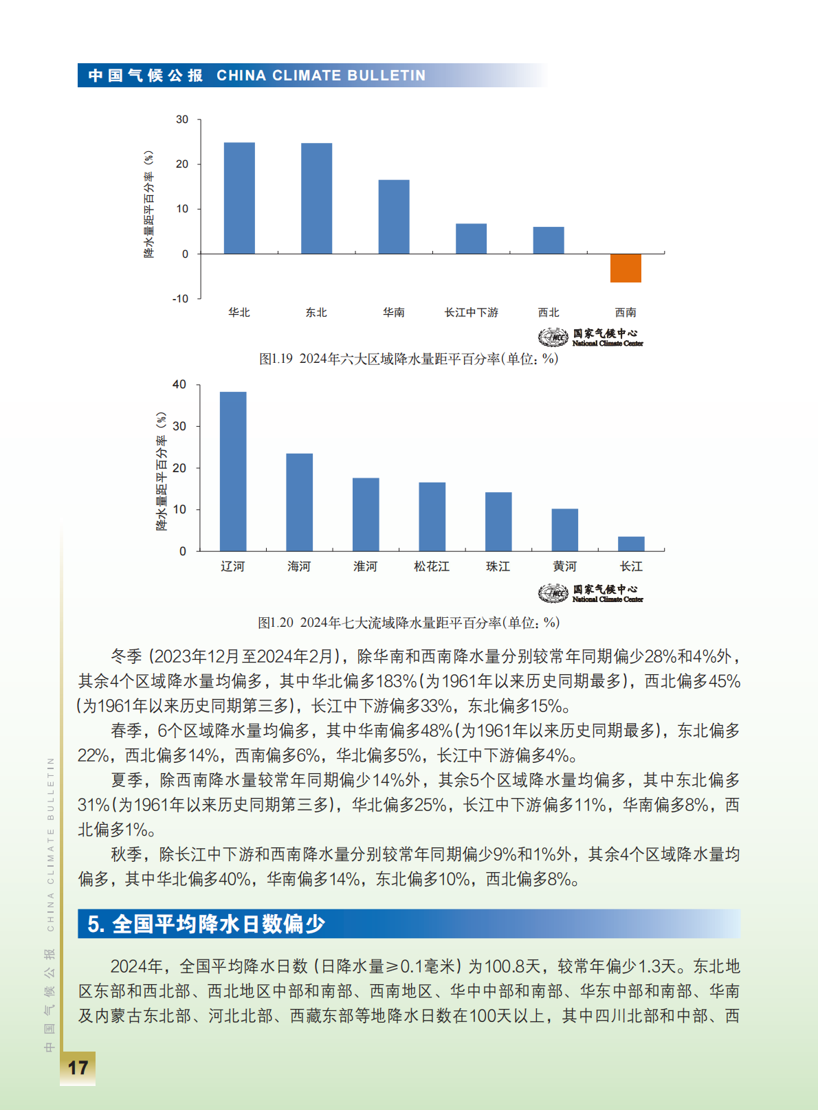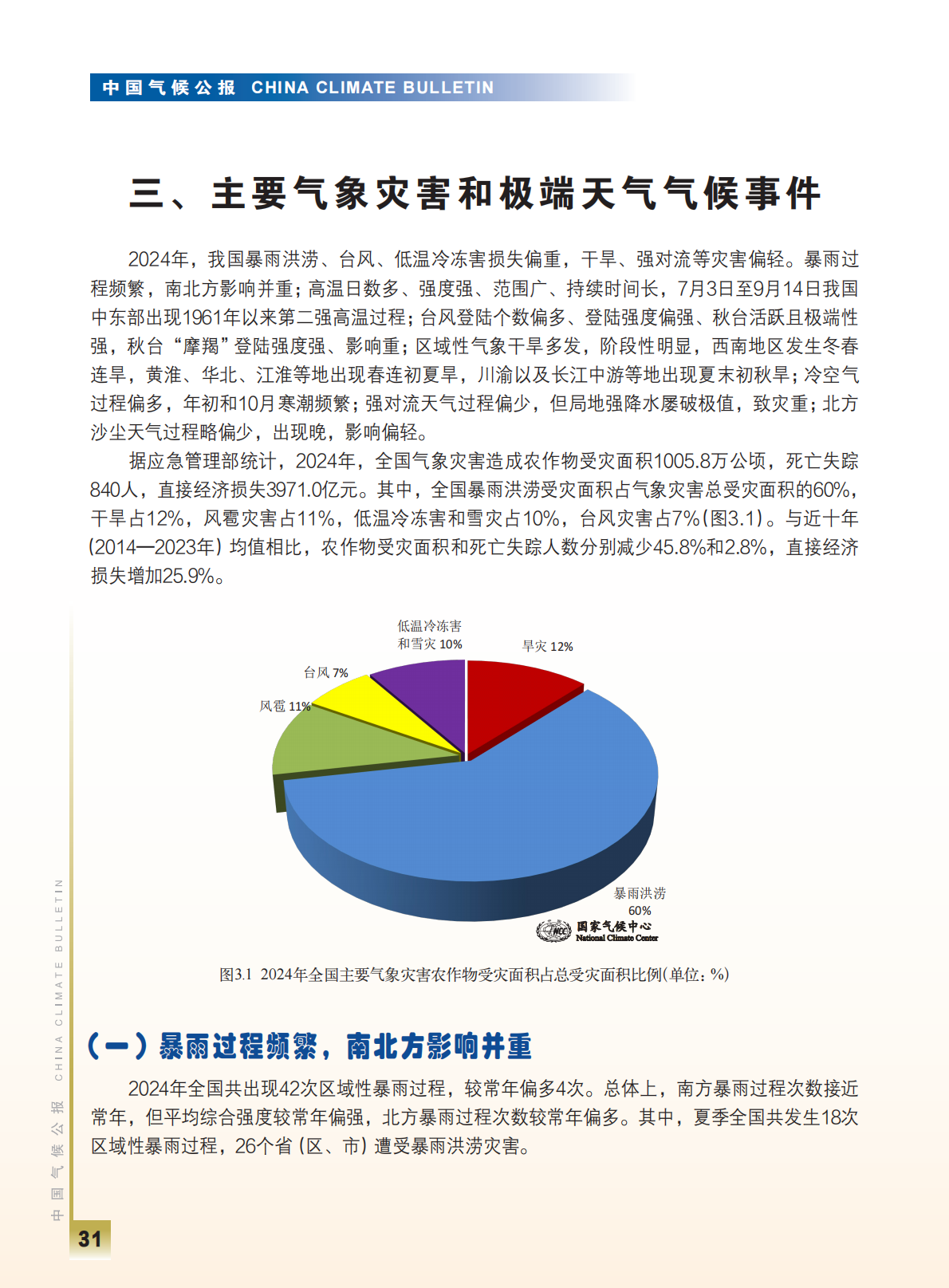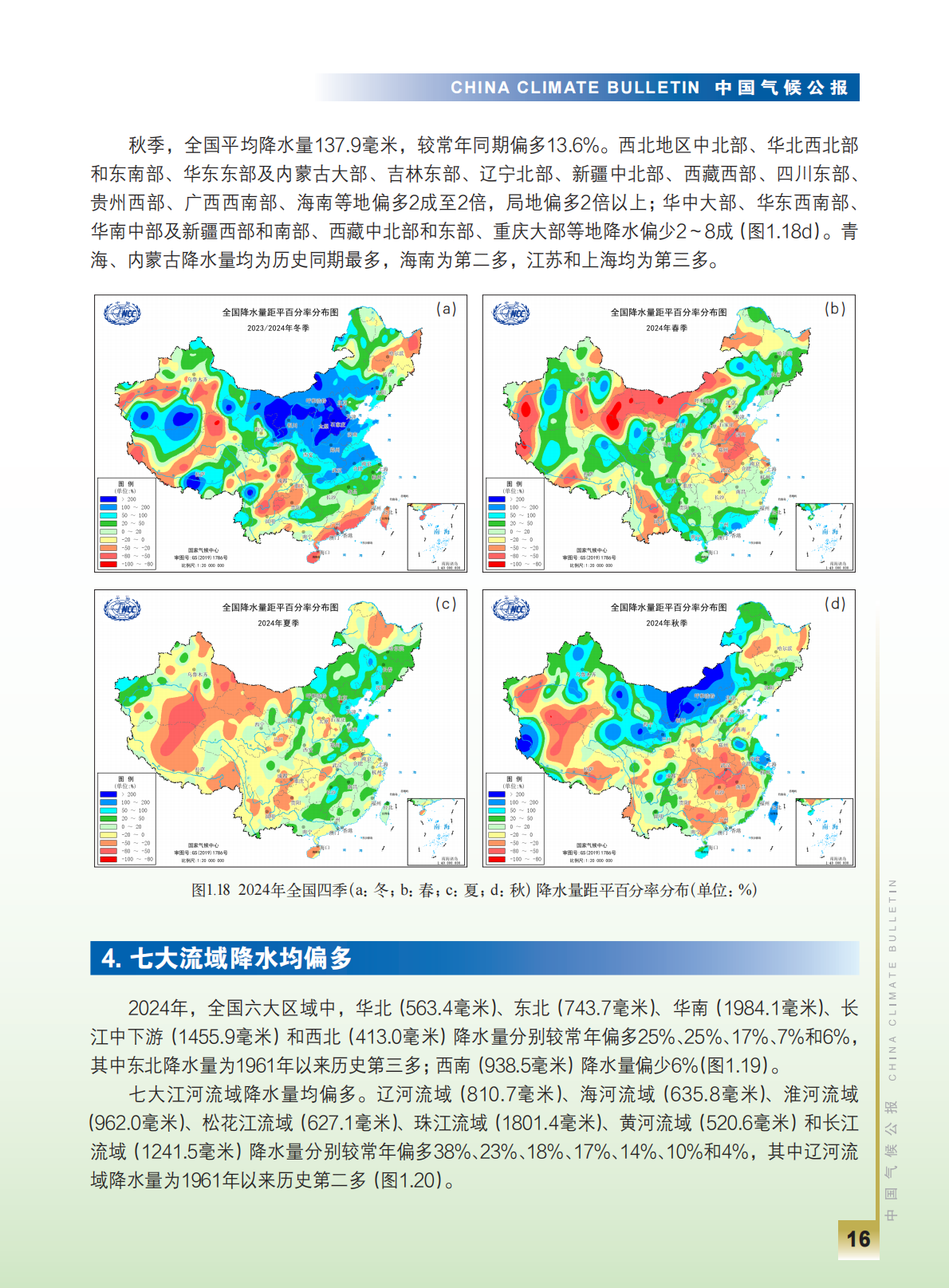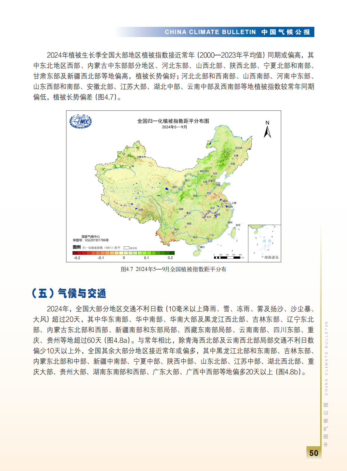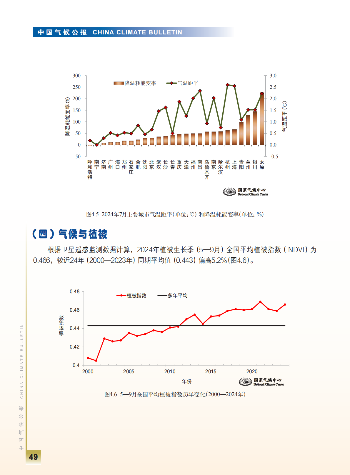 为了更好地了解中国气候,全面反映中国在气候系统监测、气候影响评估、气候服务应用等方面的新成果、新进展,中国气象局国家气候中心组织30余位专家编写了《中国气候公报(2024)》。公报内容分为五章,分别从基本气候概况、气候系统监测、主要气象灾害和极端天气气候事件、气候影响评估等方面提供中国气候的最新监测和评估信息,可为各级政府制定气候相关政策提供科技支撑,并为开展国内外科研与技术交流以及气候科普宣传提供基础信息。