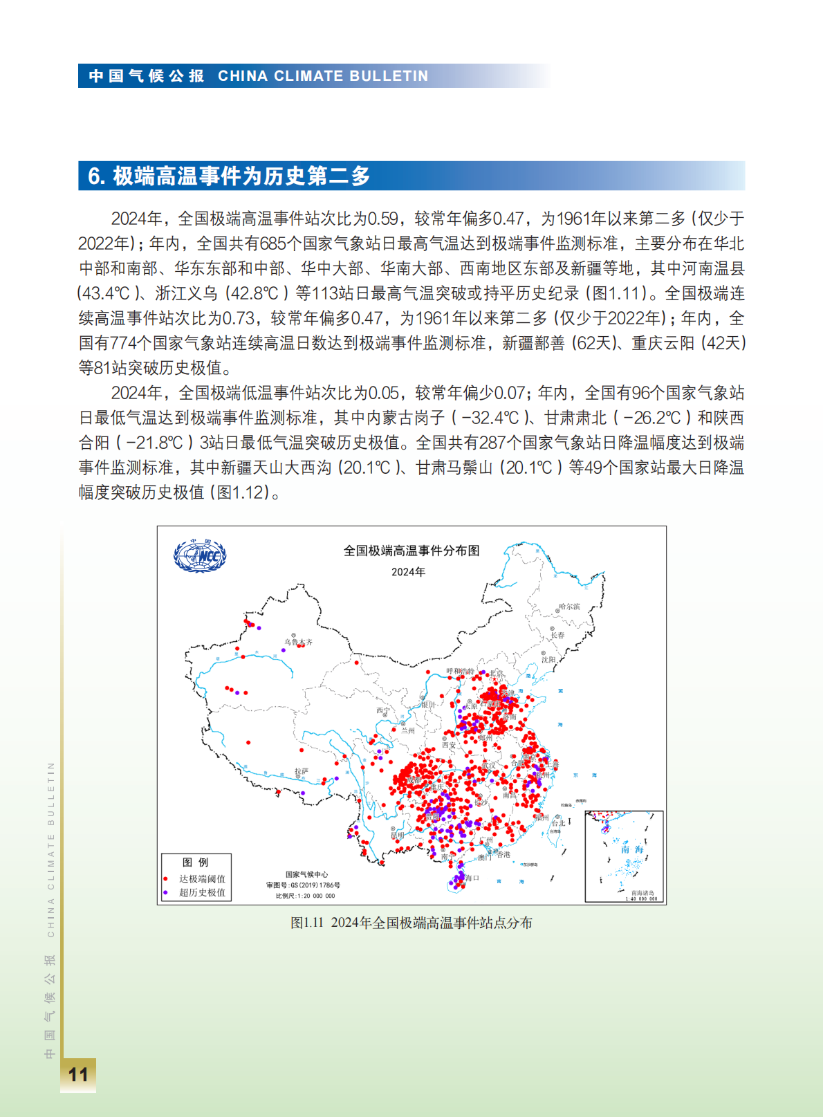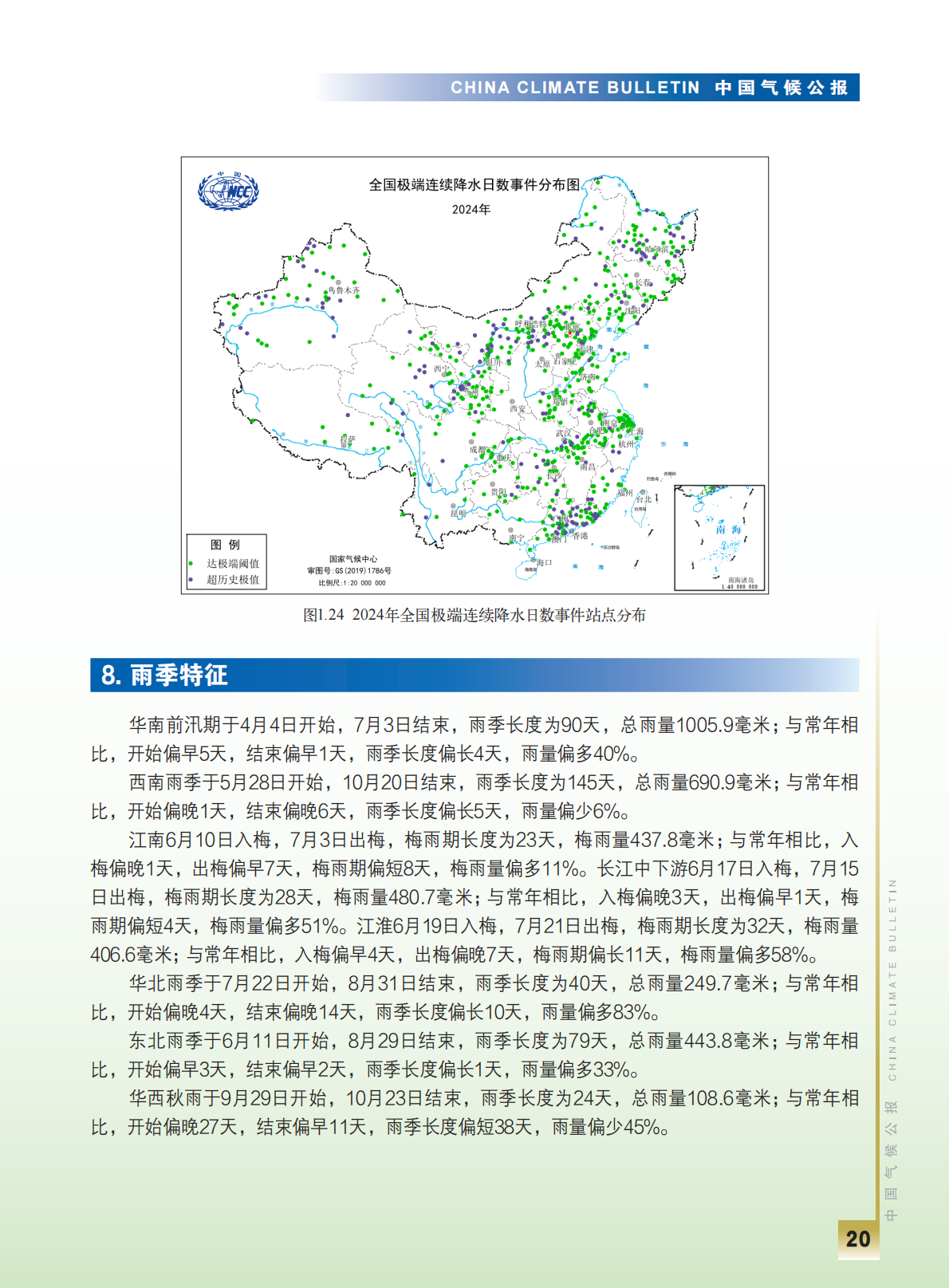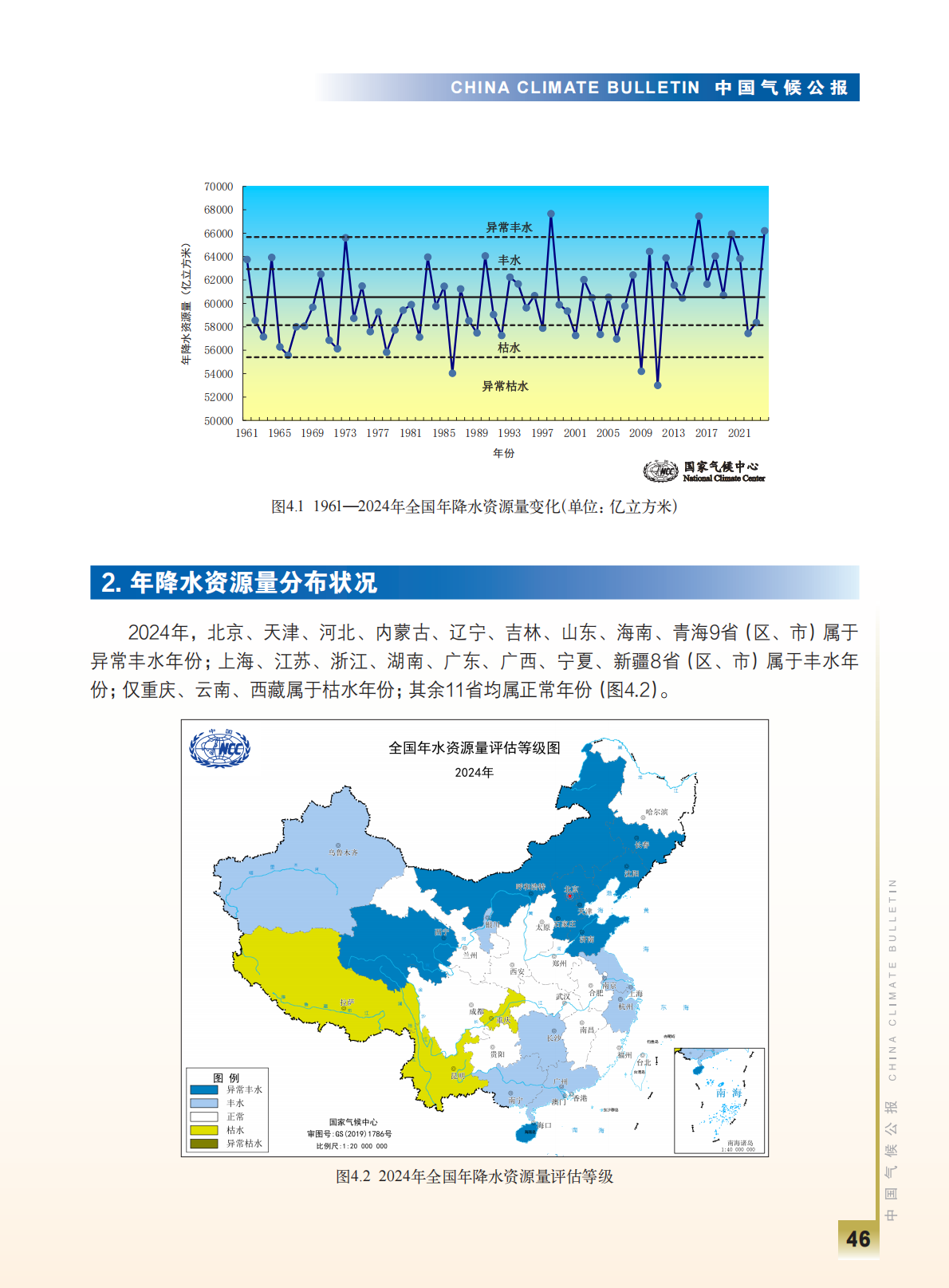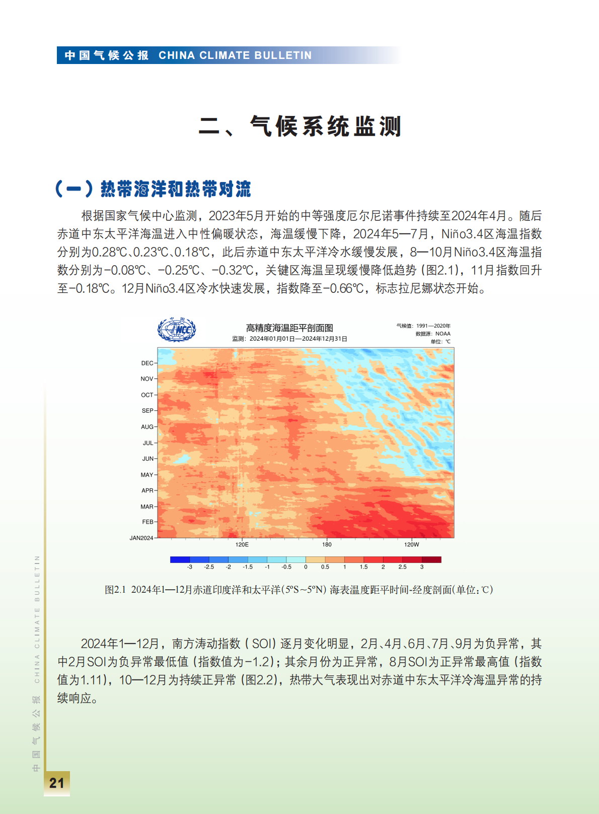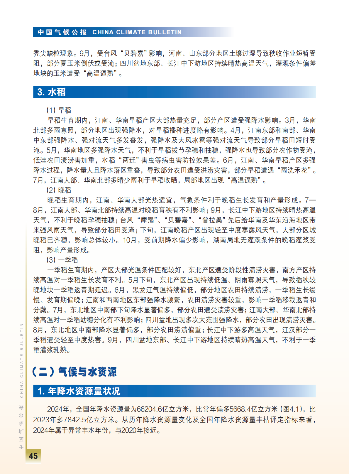 为了更好地了解中国气候,全面反映中国在气候系统监测、气候影响评估、气候服务应用等方面的新成果、新进展,中国气象局国家气候中心组织30余位专家编写了《中国气候公报(2024)》。公报内容分为五章,分别从基本气候概况、气候系统监测、主要气象灾害和极端天气气候事件、气候影响评估等方面提供中国气候的最新监测和评估信息,可为各级政府制定气候相关政策提供科技支撑,并为开展国内外科研与技术交流以及气候科普宣传提供基础信息。