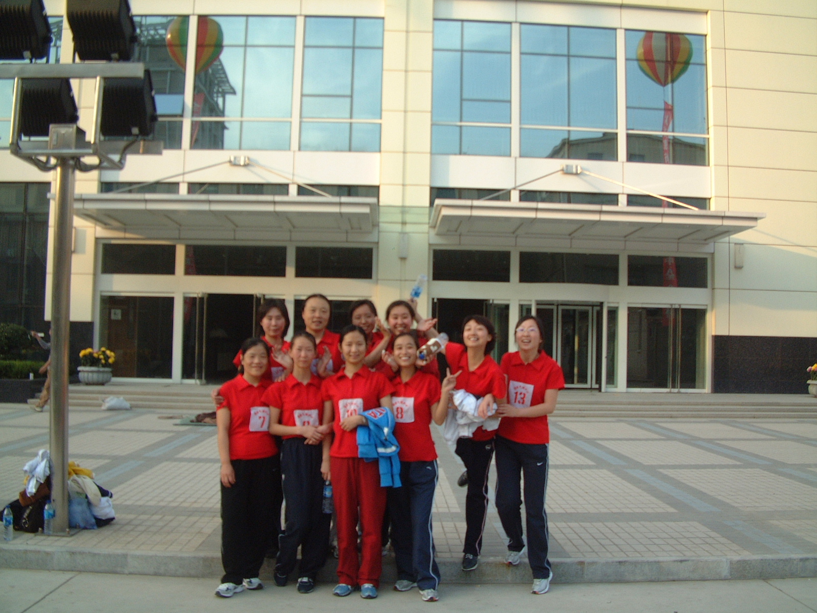 10月15日是举行新大楼搬迁仪式的日子,队员们因忙于打球未能参加。离开赛场,大家来到罩在金色阳光下的新气候科技大楼的楼前,亲密无间的相拥在一起拍照,那一张张赛后还未退尽红晕的脸上笑的是那样的灿烂,在红色运动衣的映衬下,好像是一支支玫瑰在盛开着。