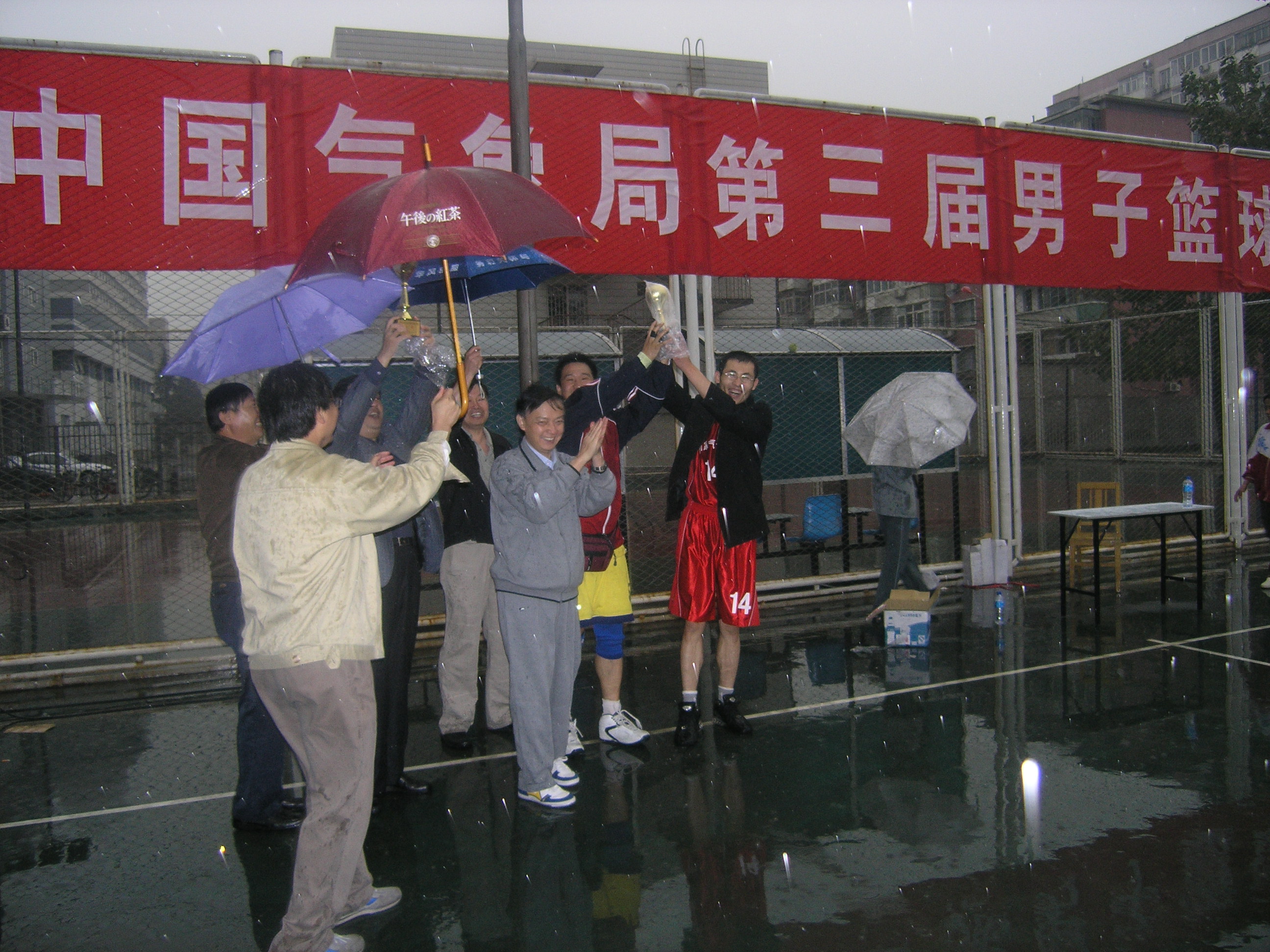 10月20日(上周五)我中心男篮在与大气探测队的比赛中,因球艺、悬殊未能进入前1、2名的决赛。21日(上周六)下午我中心男篮与气象信息中心男篮争夺3、4名。决赛开始后,我中心男篮很好地控制住了场上的局面,以15比11打赢了上半场。只是天公不作美,下半场天空阴沉沉的越来越黑,在比赛进行了5、6分钟后突然之间下起了雨把场地浇得又湿又滑。在如此困难的情况下,运动员们仍然反应敏捷,全力以赴,在雨中你争我夺,越打越勇。董文杰主任和游有源副书记带领着拉拉队冒雨为运动员加油助威,运动员在雨中尽展体育运动的风采,形成了一道别样的风景线。在赛到一半的时候,雨越下越大,球赛似乎成了一场水战,队员们不敢跑得太快,球也湿了,不易拿稳,根本无法运球,因此比赛被迫暂停。赛委会考虑不可能为两个队在组织一次比赛,最后判定气候中心男篮和气象信息中心男篮并列第三名。