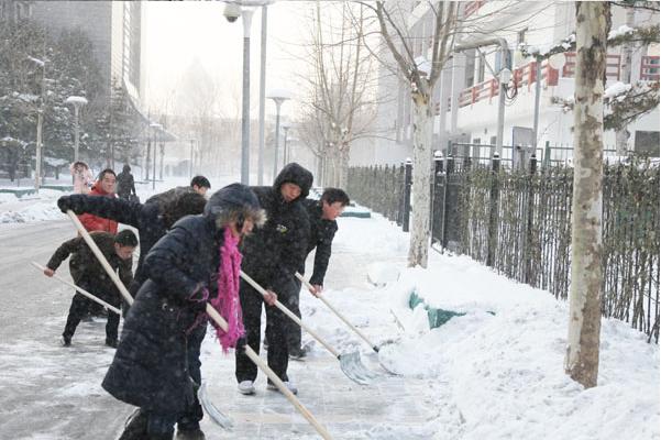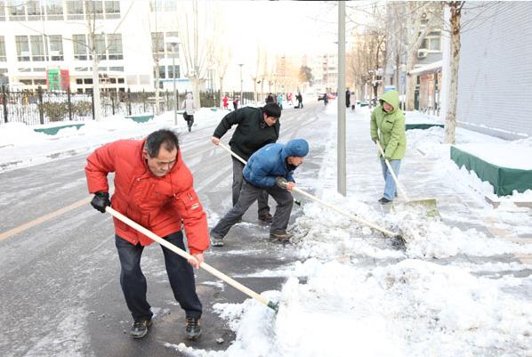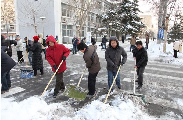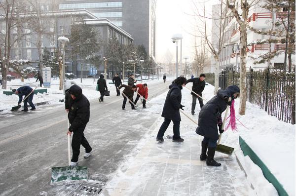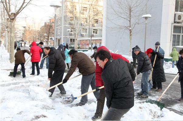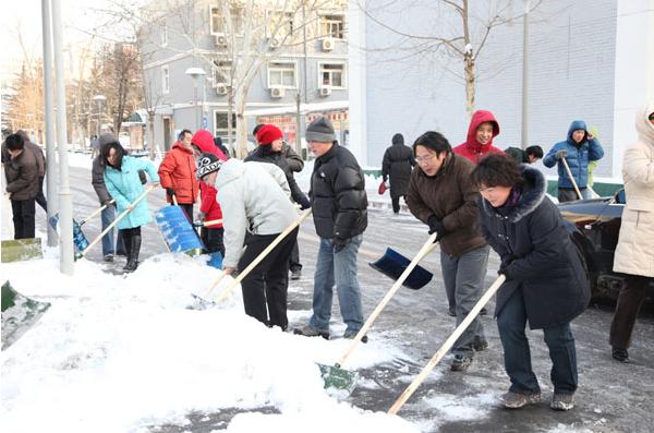 1月3日,北京迎来了2010年的第一场雪,大雪将气象局园区装饰得银装素裹,景象分外妖娆,但大雪也给工作生活带来了不便。 4号,是元旦假期后上班的第一天,早晨8点,国家气候中心的干部职工在党委副书记游有源带领下,拿着扫把、铁锹在零下12度的严寒中进行铲雪、清雪。经过近一个小时的劳动,及时清扫了积雪,确保了责任区内的道路通畅。
